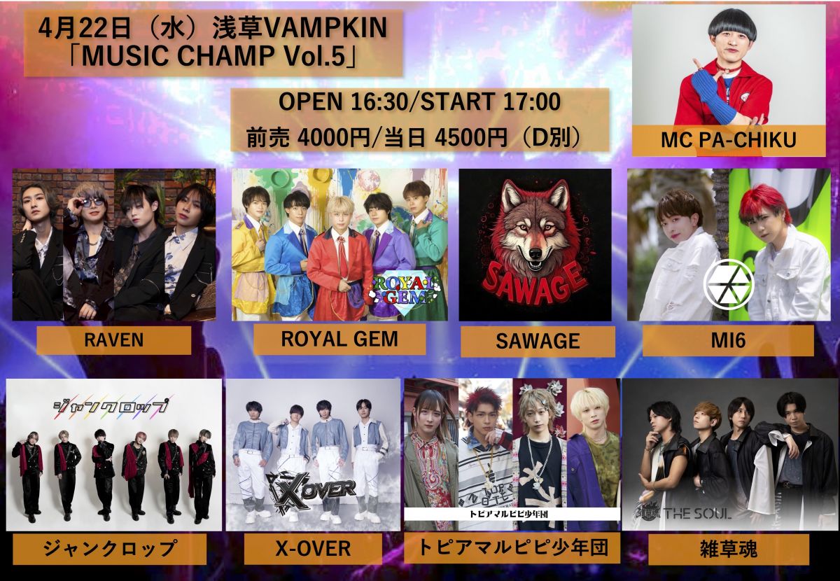 📢雑草魂出演情報🌱MUSIC CHAMP Vol.5日程 4月22日(水)会場 浅草VAMPKINOPEN 16:30/START 17:00前売 4000円/当日 4500円(D別)#雑草魂#ざっそうる